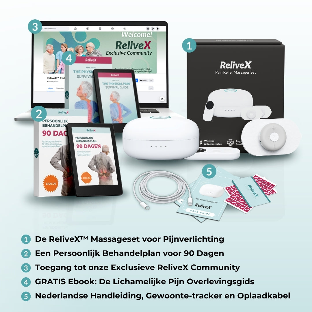 De ReliveX™ Massageset is ontworpen voor mensen met rugpijn, hernia, schouderpijn, nekklachten, spiervermoeidheid of spanning. Het helpt ook bij klachten door stress of langdurig zitten. Bij twijfel adviseren we altijd om medisch advies in te winnen.